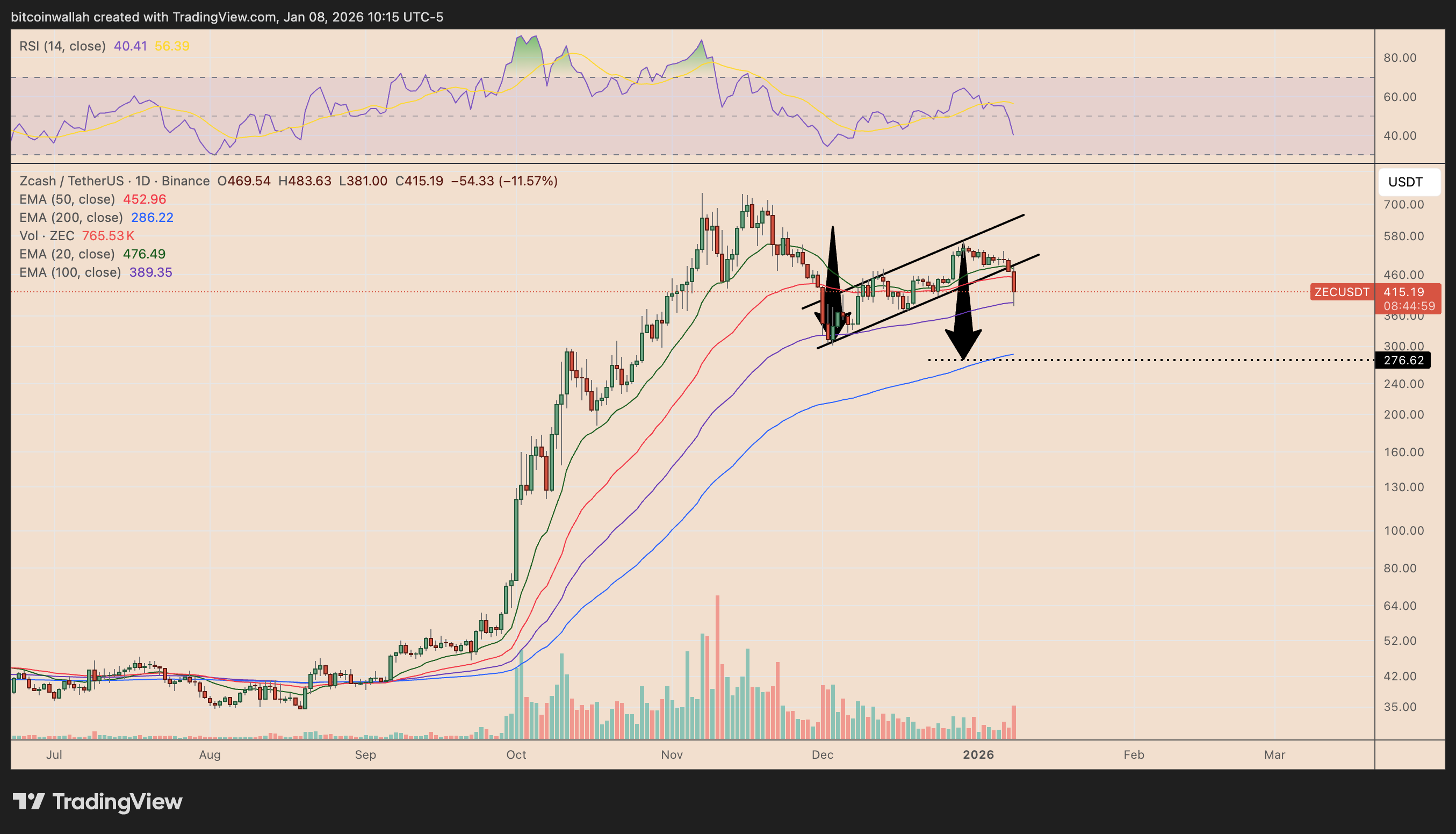 ZEC’s price can drop another 40-50% in the coming weeks, according to a technical setup shared by analyst Osemka.