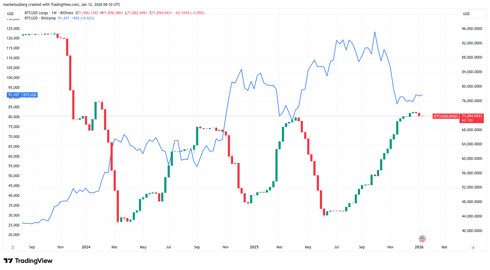 Bitfinex longs at the moment whole round 71,800 BTC, marking their lowest ranges since Dec. 15.