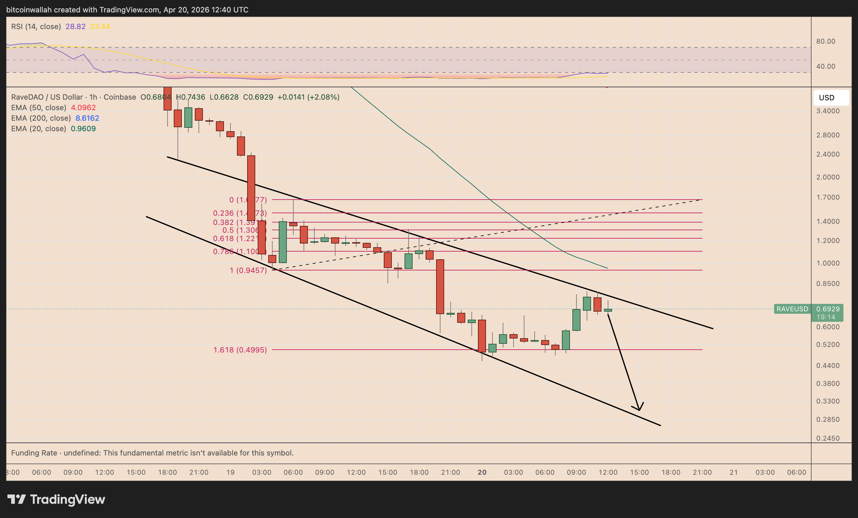On the per hour chart, RAVE continues to trade inside a coming down channel, with lower highs and lower lows forming in between 2 downward-sloping pattern lines.