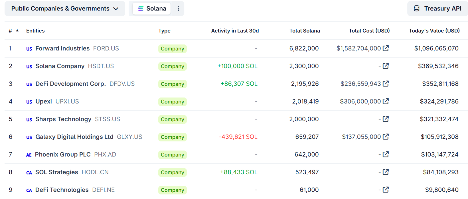 The sale of 439,621 SOL by Galaxy Digital Holdings (GLXY) has actually raised issues about the sustainability of Solana’s business reserve method. Forward Industries (FORD) holds the biggest position, with 6.82 million SOL, a figure that has actually stayed constant over the previous one month, according to CoinGecko information.