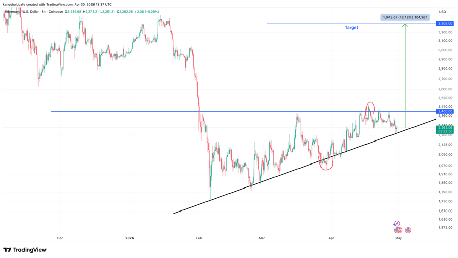 Ether ( ETH) has actually rebounded more than 25% from its February low listed below $1,800, and a mix of technical and onchain signals recommends the healing might still have more space to run in May.