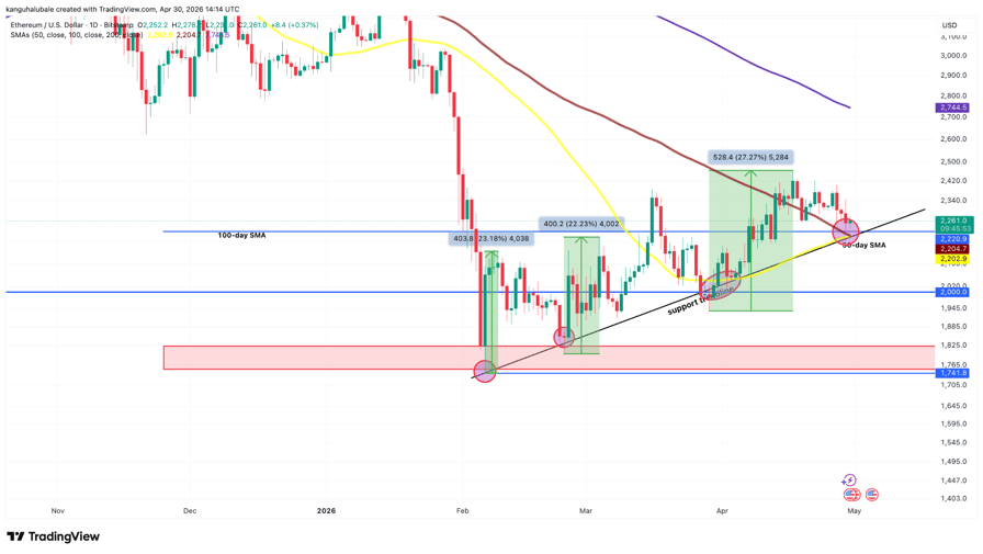 Ether is now combining near the pattern line assistance around $2,000-$ 2,200, which likewise accompanies the 50-day (yellow wave) and 100-day SMAs (brown), a crucial vibrant assistance level in continuous uptrends.