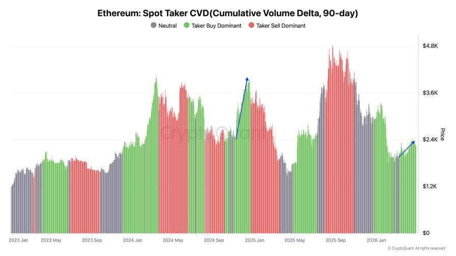 Ether’s 90-day area taker cumulative volume delta (CVD) reveals that buy-orders (taker purchase) have actually ended up being dominant once again. CVD determines the distinction in between buy and offer volume over 3 months.