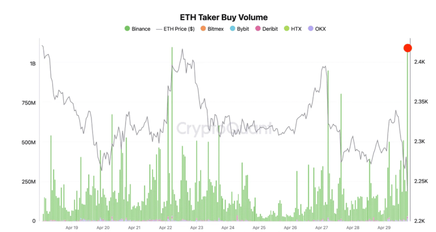 On the other hand, Ether’s taker purchase volume leapt to over $1 billion on Wednesday, recommending bulls benefited from the drop listed below $2,300 to purchase more, information from CryptoQuant programs.