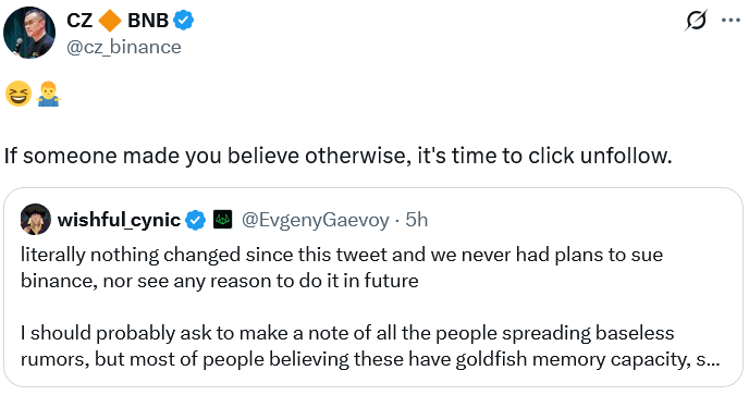 ” We never ever had strategies to take legal action against Binance, nor see any factor to do it in future,” Gaevoy published to X Monday, including: “I need to most likely ask to take down all individuals spreading out unwarranted reports, however the majority of individuals thinking these have goldfish memory capability, so I wont.”