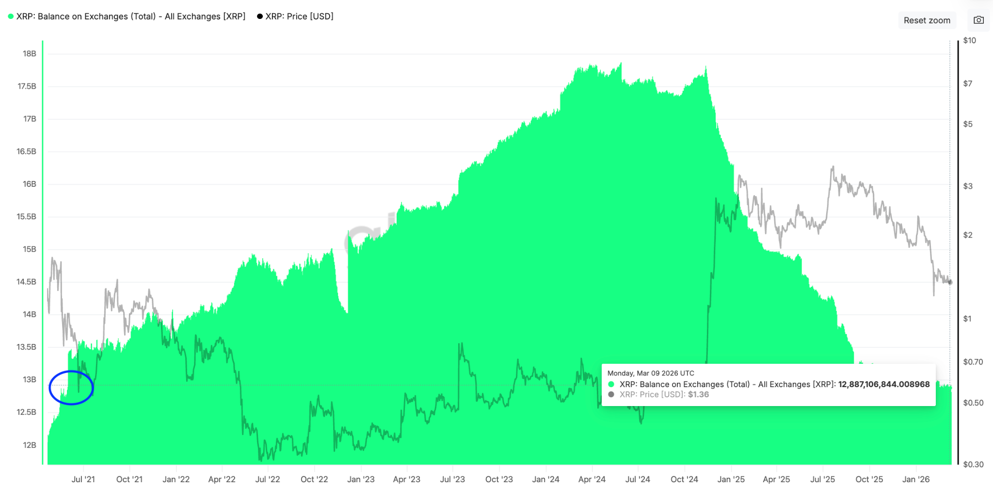 The XRP balance on exchanges dropped to 12.8 billion on Friday, levels last seen in Might 2021.