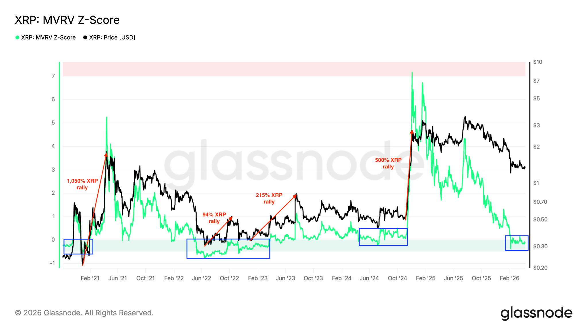 XRP’s MVRV Z-score is hovering near absolutely no, a level that traditionally lines up with build-up zones and market bottoms.