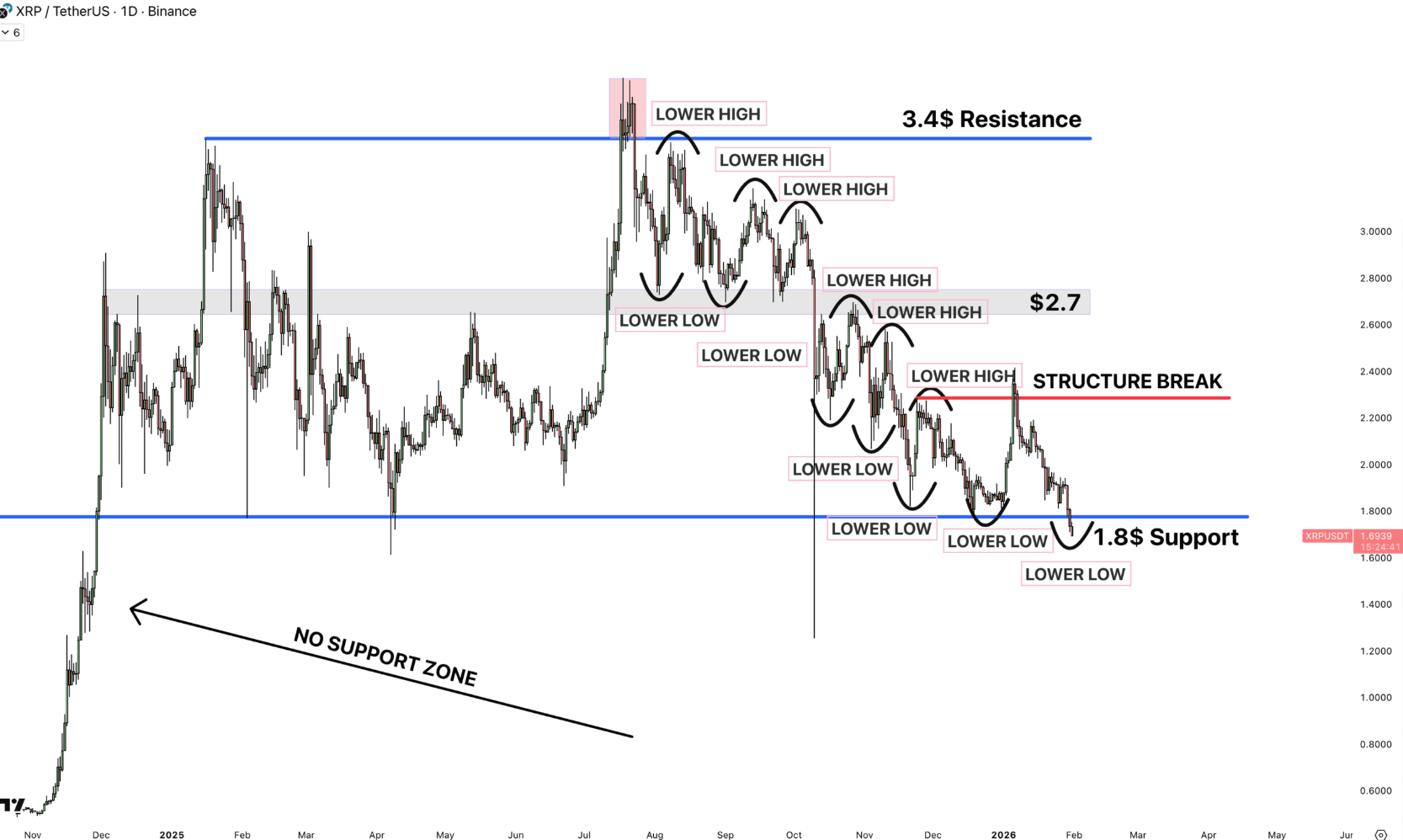XRP’s healing to $2.40 in January ended up being a “fakeout” as the rate continued to form “rate formed a fresh lower lows,” pseudonymous expert AltCryptoGems stated in a current post on X, including: