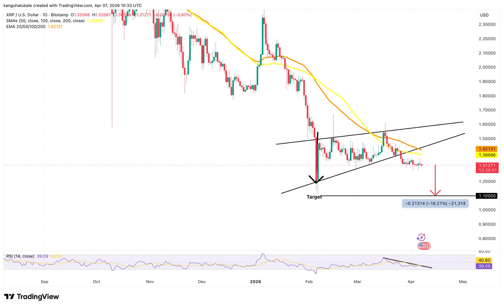If XRP stops working to recover the trendline and moving averages, the setup indicate a much deeper approach the pattern’s determined target near $1.10, approximately 16% listed below the present levels.
