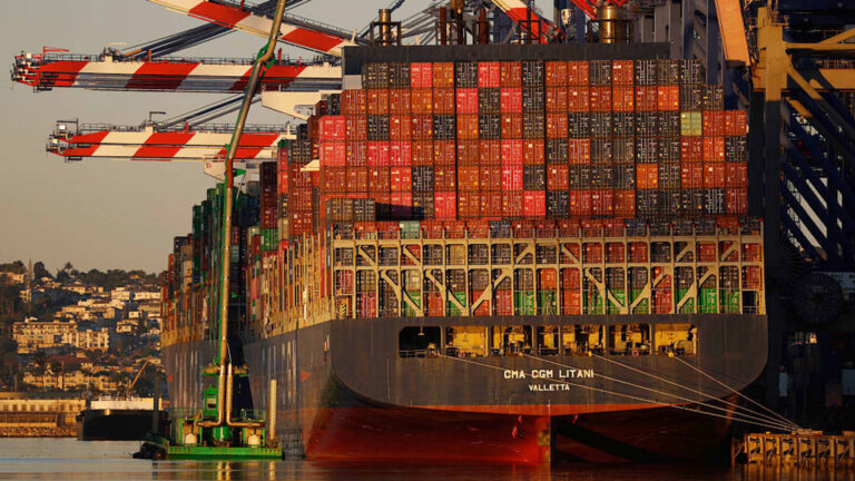 A container ship is seen docked at the Port of Los Angeles on March 13, 2026 in Los Angeles, California.