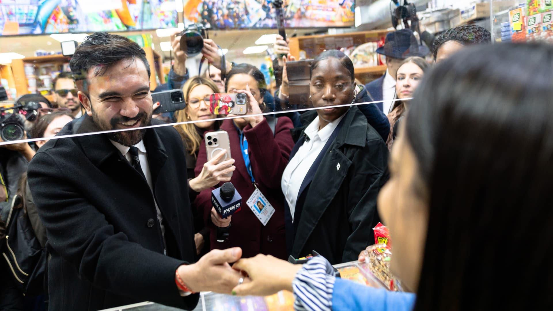 Zohran Mamdani welcomes a bodega employee before an interview on October 29, 2025 in the Belmont community of the Bronx district in New york city City.